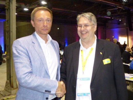 Fritz Haugg gratuliert als Delegierter des 66. Ordentlichen Parteitags der FDP in Berlin Christian Lindner zur erfolgreichen Wiederwahl. 92,4% sind ein mehr als deutlicher Vertrauensbeweis für die Arbeit von Christian Lindner und seinem Team. So ist die FDP auf dem richtigen Weg zum Wiedereinzugliedern der. Den Deutschen Bundestag im Jahr 2017.