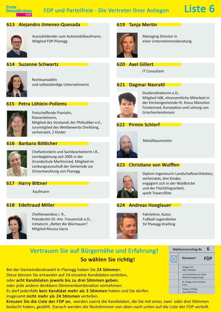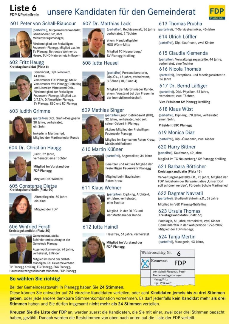 Auch ohne Frauenquote haben wir einen Anteil von 50% Frauen. Ebenso ist die Verteilung zwischen den Ortsteilen mit 60% Planeggern und 40% Martinsrieder sehr ausgeglichen. Mit den Gemeinderäten Peter von Schall-Riaucour, Fritz Haugg und Winfried Ferstl hat die FDP Planegg erstmals drei Gemeinderäte auf der Liste. Viele Kandidaten auf unserer Liste sind in Vereinen engagiert.